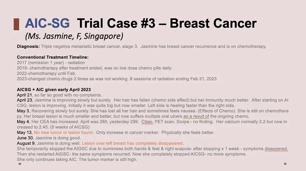 Cancer is a systemic disease that finds its cause and enablement in many aspects of a patient’s life. Therefore, we believe in treatments that target not only the cancer but the patient as a whole. Often even good therapies that are non-toxic could also lay a burden on the patient’s organs in the healing process, and it is important that the patient’s ability to handle the treatment must be constantly monitored to reap successful outcomes. In utilizing AIC + AICSG combination therapy as a part of a more comprehensive treatment, we recommend only qualified physicians incorporate the therapy with careful monitoring for TLS (Tumor Lysis Syndrome) and electrolyte disturbances that could result from rapid tumor necrosis, especially with concurrent conventional treatments such as radiation therapy and chemotherapy.