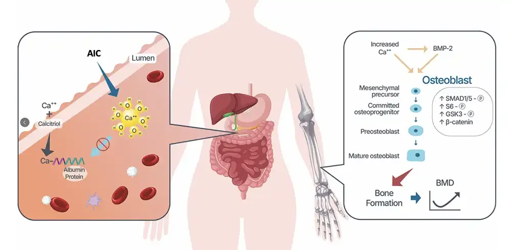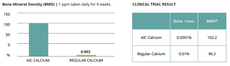 Inside our cells, AIC ionic calcium quickly breaks down to yield calcium ions, which are absorbed into capillaries and triggers our body’s natural bone formation process.