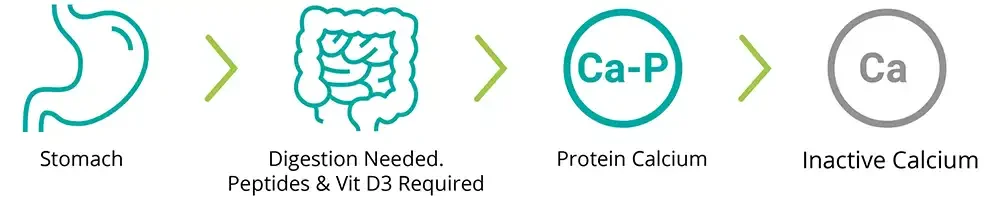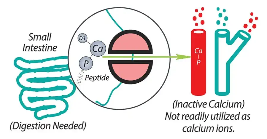 Regular calcium intake from diet or supplements need strong stomach acid with peptides and vitamin D3 to digest and be absorbed in small intestines as protein-bound calcium, which is not readily utilized with aging because of a sedentary lifestyle, hormonal changes, and poor diet. Various side effects of inactive calcium include kidney stones, blood vessel calcification, stroke, heart attack, etc. Most, if not all, calcium supplements fall in this category and may aggrevate body-wide calcification which is known to be one of many major cause of degenerative diseases.