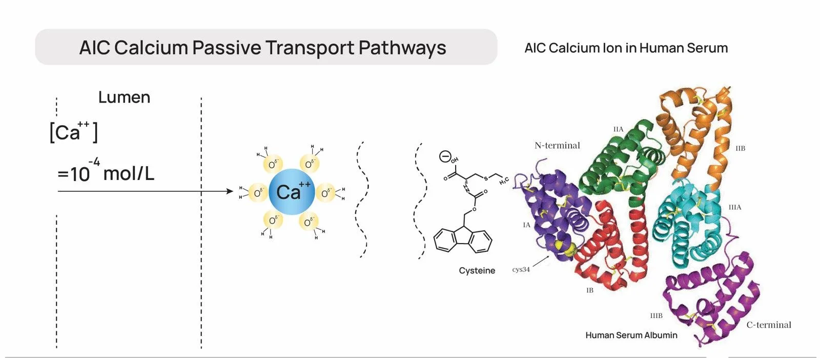 AIC is absorbed only as ionic calcium and is wrapped in the coordination bond of water molecules, avoiding binding with albumin, increasing the amount of ionic calcium in the blood, and all hormones and enzymes related to calcium channels, various cell metabolism activities, p53 function activation, etc.