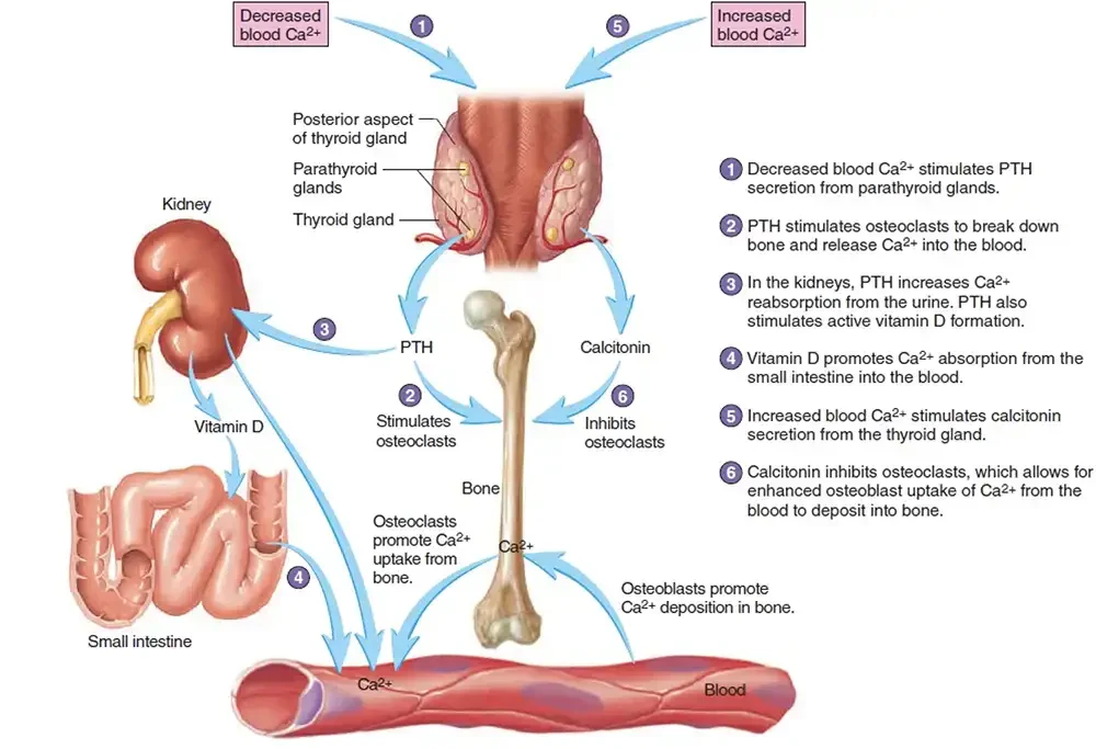 Calcium homeostasis is maintained by three hormones: parathyroid hormone (PTH) from the parathyroid glands, vitamin D from the skin or diet, and calcitonin from the thyroid gland. PTH and vitamin D are secreted when blood ionic calcium levels are too low, and calcitonin is secreted when blood ionic calcium levels are too high. When serum ionic calcium level is slightly increased by the therapy, the thyroid releases calcitonin, which works to decrease blood calcium levels by inhibiting osteoclast activity. Even in the absence of osteoclast activity, osteoblast activity continues, removing calcium from the blood and depositing it into the bone.