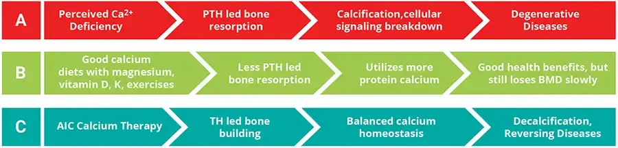 With AIC Therapy, thyroid hormone (TH) led bone-building restores calcium homeostasis and leads to body-wide decalcification, which helps to reverse calcium-related degenerative diseases.