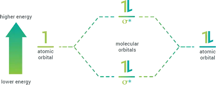 Anytime two atomic orbitals combine to give a lower-energy bonding orbital, an analogous higher-energy anti-bonding orbital is also formed. Take a look at a figure depicting this simple bond/anti-bond molecular orbital diagram that we had for hydrogen. The diagram also shows that electrons (in this case) completely fill the bonding orbital and leave the anti-bonding orbital empty.