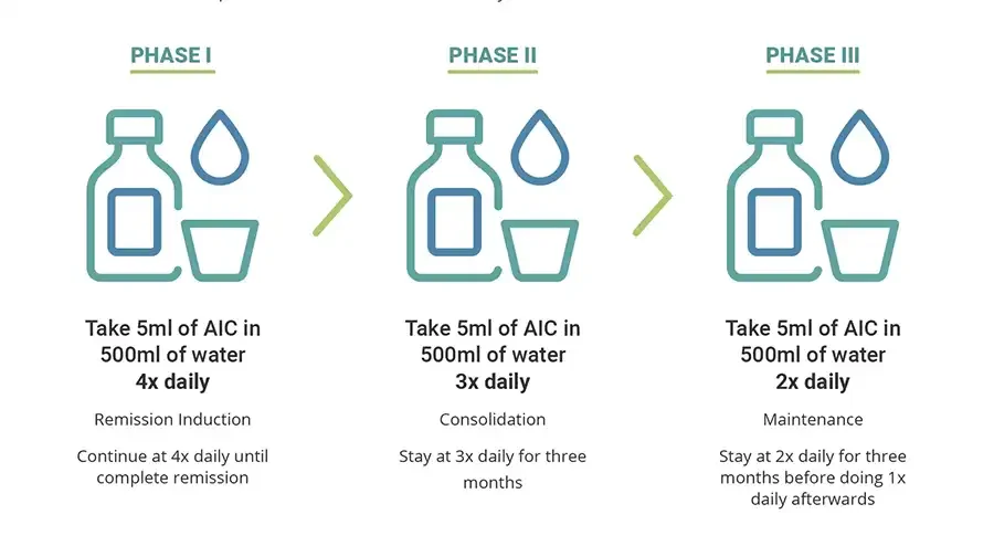 AIC Therapy can be used in conjunction with other treatments as it promotes the calcitonin-based natural bone-remodeling process and consequently restores calcium balance at the cellular level. However, it may take time for the systemic effects of these cellular changes to manifest. Bone markers such as CTx and P1NP or bone scans such as REMS and DEXA can detect these changes. We suggest that patients take AIC Therapy for a minimum of 3 doses a day for at least 3 months to experience its positive effects. We recommend patients continue for another 3 months to experience more positive benefits (total 6 months).