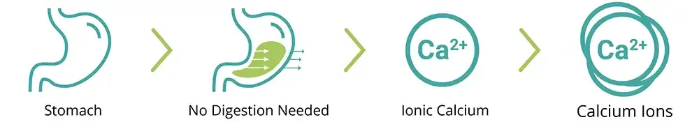 Unlike regular calcium intake, no Vitamin D3 and peptides are needed for absorption. AIC diffuses passively through digestive tract cell linings (mucosa) as ions, not requiring physiological energy from our body and readily available for immediate use.